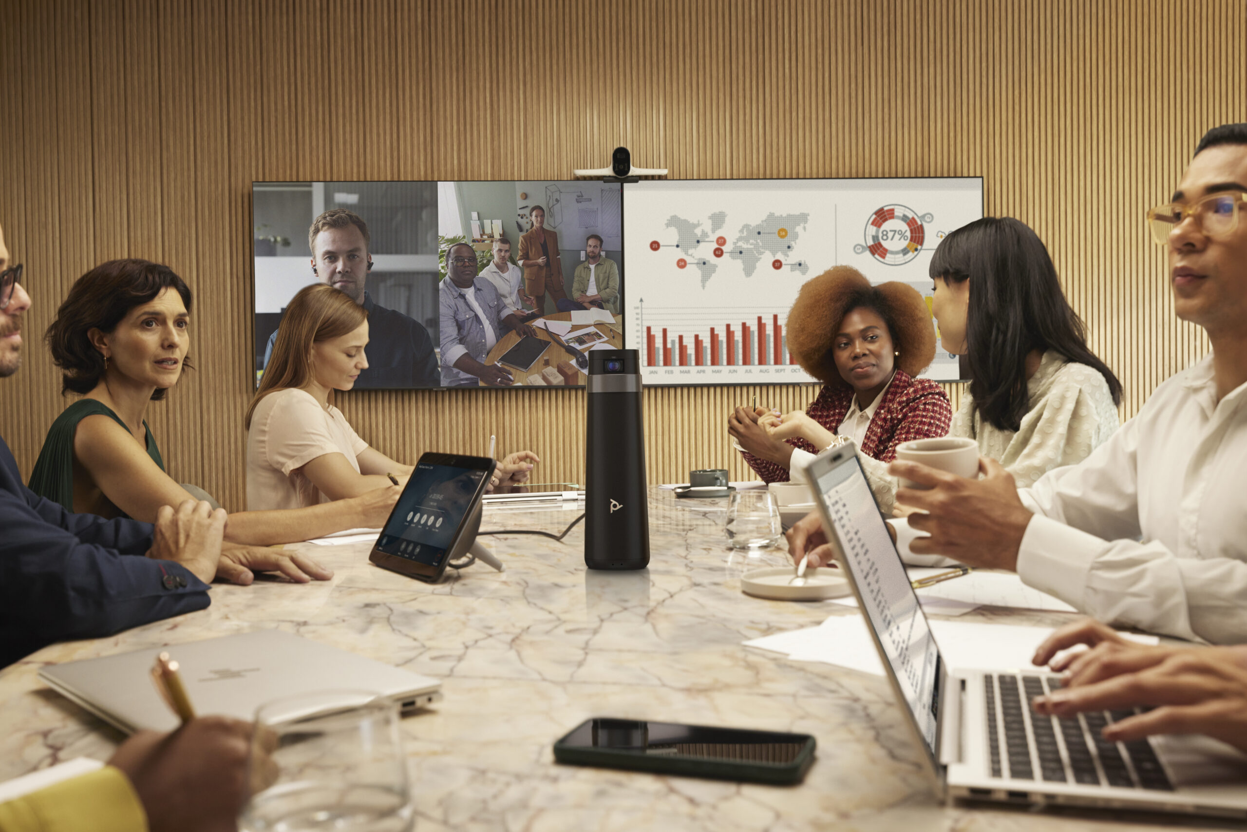The Poly Studio E70 is an intelligent camera that brings clear video quality, and advanced analytics to meeting rooms. Dual cameras are boosted by Poly DirectorAI technology to create a vibrant video experience.
