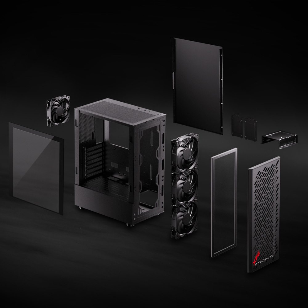 | – Midi Tower PC – ATX, micro ATX, Mini-ATX – Ondersteunde HDD-groottes: 2.5,3.5″ SSD-vormfactor: 2.5″ HDD/SSD-combimodel – Aantal 2.5″ bays: 3 Aantal 3.5″ bays: 2 – Zijraam Geharde glaspla(a)t(en) – Koolstofstaal, Gehard glas – Zwart |