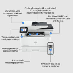 | – Bedrijf Laser Zwart-wit afdrukken – 1200 x 1200 DPI – Printkleuren: Zwart – A4 40 ppm – KopiĆ«ren in kleur Scannen in kleur Zwart-wit faxen – Apple AirPrint, Mopria Print Service – Direct printen – USB-poort Wifi Ethernet LAN Bluetooth – Intern geheugen: 512 MB Type processor 1200 MHz – 12,6 kg |