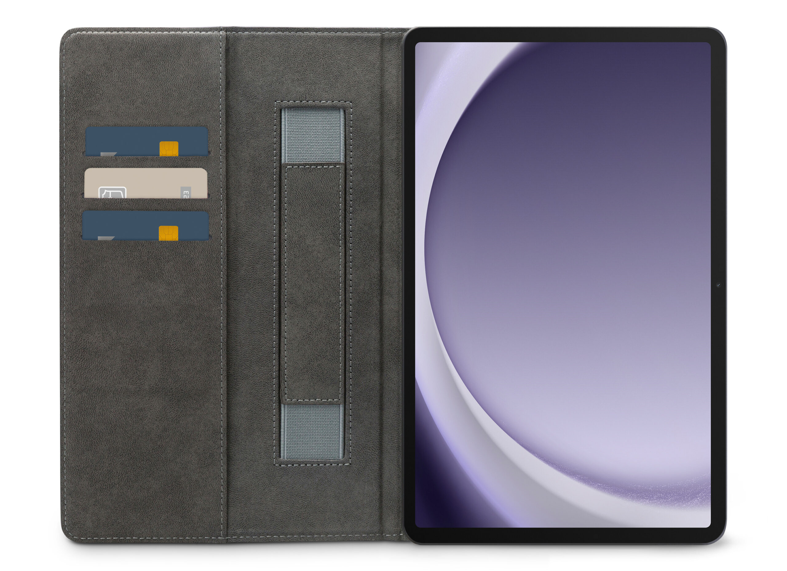 Aan de linker binnenkant van de case zitten drie vakjes voor pasjes, briefgeld en/of visitekaartjes. De case beschikt over een stand functie, zodat je hem makkelijk neer kunt zetten om bijvoorbeeld Netflix of foto’s te kijken. Ook heeft hij aan de linker binnenkant een band waar je hand doorheen kan steken zodat je jouw tablet goed vast kan houden.