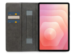 Aan de linker binnenkant van de case zitten drie vakjes voor pasjes, briefgeld en/of visitekaartjes. De case beschikt over een stand functie, zodat je hem makkelijk neer kunt zetten om bijvoorbeeld Netflix of foto’s te kijken. Ook heeft hij aan de linker binnenkant een band waar je hand doorheen kan steken zodat je jouw tablet goed vast kan houden.