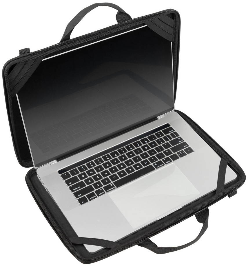 Veilige bevestiging: Speciale bevestigingsbanden in de hoeken houden de laptop stevig op zijn plaats.