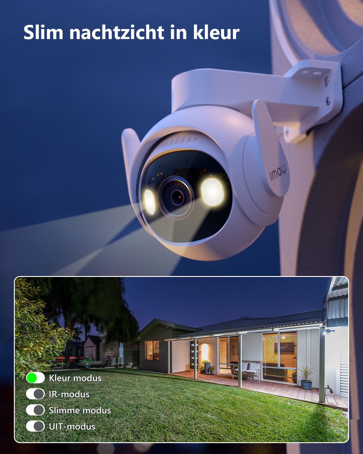 1. Slim nachtzicht: als het donker wordt, gebruikt de camera infrarood om afbeeldingen in grijstinten weer te geven. Zodra de camera een persoon detecteert, worden de ingebouwde spots geactiveerd om in kleur op te nemen.