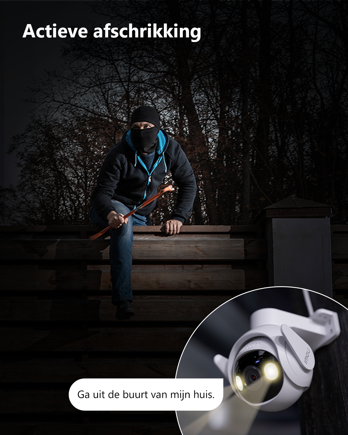 De Cruiser 2 3K buitencamera identificeert accuraat personen en voertuigen met de AI detectiefunctie. Valse alarmen van bijvoorbeeld dieren of vallende bladeren worden hierbij voorkomen. Bij detectie volgt de camera de beweging dankzij de PTZ-functie met Smart Tracking. In combinatie met een sirene van 110dB en flitsende schijnwerpers schrikt deze beveiligingscamera elke ongewenste bezoeker af. Deze 5 megapixel camera biedt ook ‘s nachts een goede beveiliging door de 4 nachtzichtstanden;