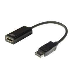 De ACT AC7555 DisplayPort naar HDMI Adapter verbindt een laptop met DisplayPort-output met een monitor of beamer met HDMI. De maximale resolutie is 1920 x 1080 @ 60Hz or 3840 x 2160 (4K) @ 30Hz. De adapter heeft vergulde connectoren.