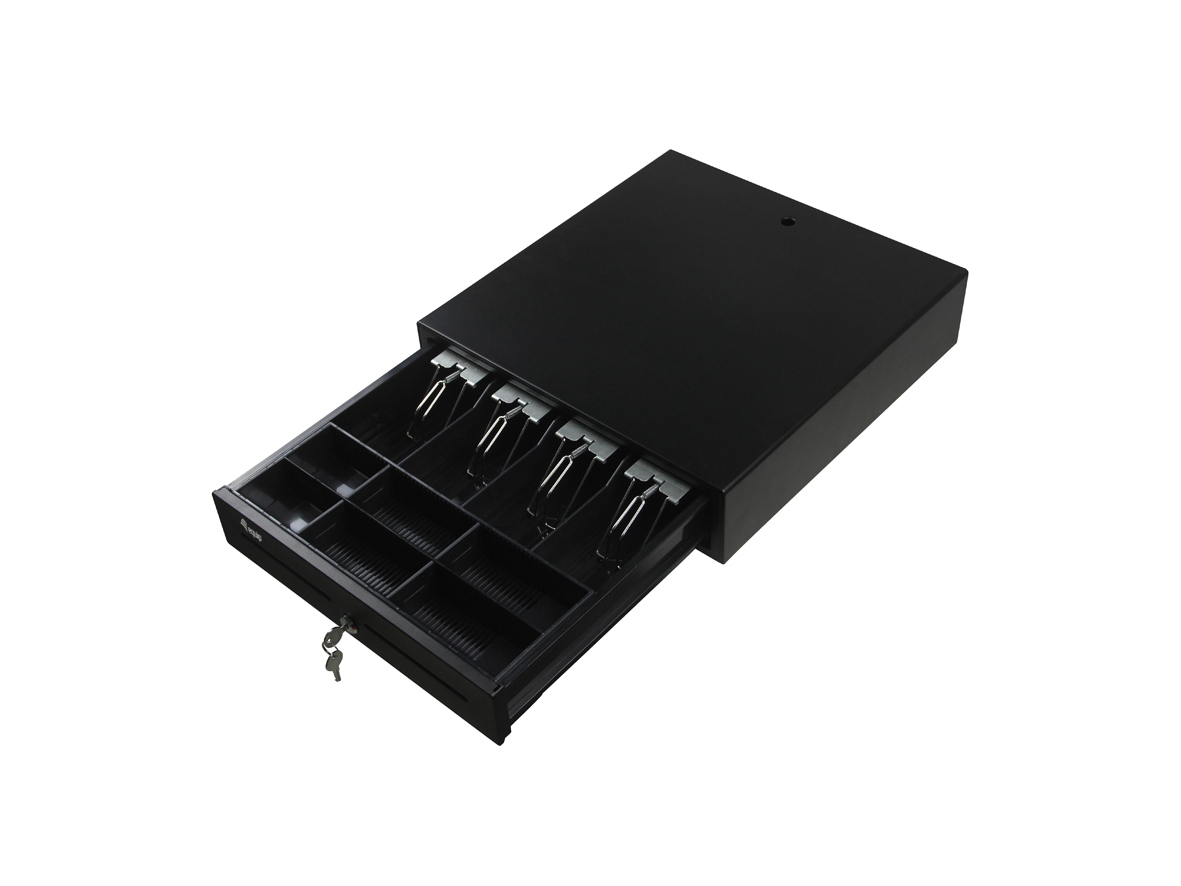 | – Handmatige kassalade – Materiaal behuizing: Metaal – Geldlade inbegrepen – Aantal biljet compartimenten: 4 – Aantal munt compartimenten: 8 – Mediasleuf – Sleutelsleuf – Zwart |