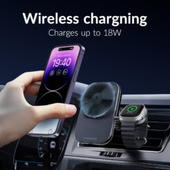 De telefoonoplader ondersteunt verschillende laadvermogens, wat afhankelijk is van je apparaat. Android-telefoons met ondersteuning voor draadloos opladen kunnen profiteren van een vermogen tot maximaal 15W. Voor iPhones varieert de laadsnelheid tussen 7.5W en 10W, afhankelijk van het model. De Apple Watch-oplader levert een output van 3W en kan eenvoudig worden losgekoppeld van de Car Charger.