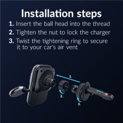 De autohouder is MagSafe-compatibel, waardoor je MagSafe-compatibele telefoon of case stevig blijft zitten, zelfs op hobbelige wegen. Dankzij het compacte ontwerp past hij perfect in elk interieur en biedt hij een nette oplossing om je apparaten georganiseerd en opgeladen te houden. De lader zelf haak je stevig vast aan de lamellen van je luchtrooster.