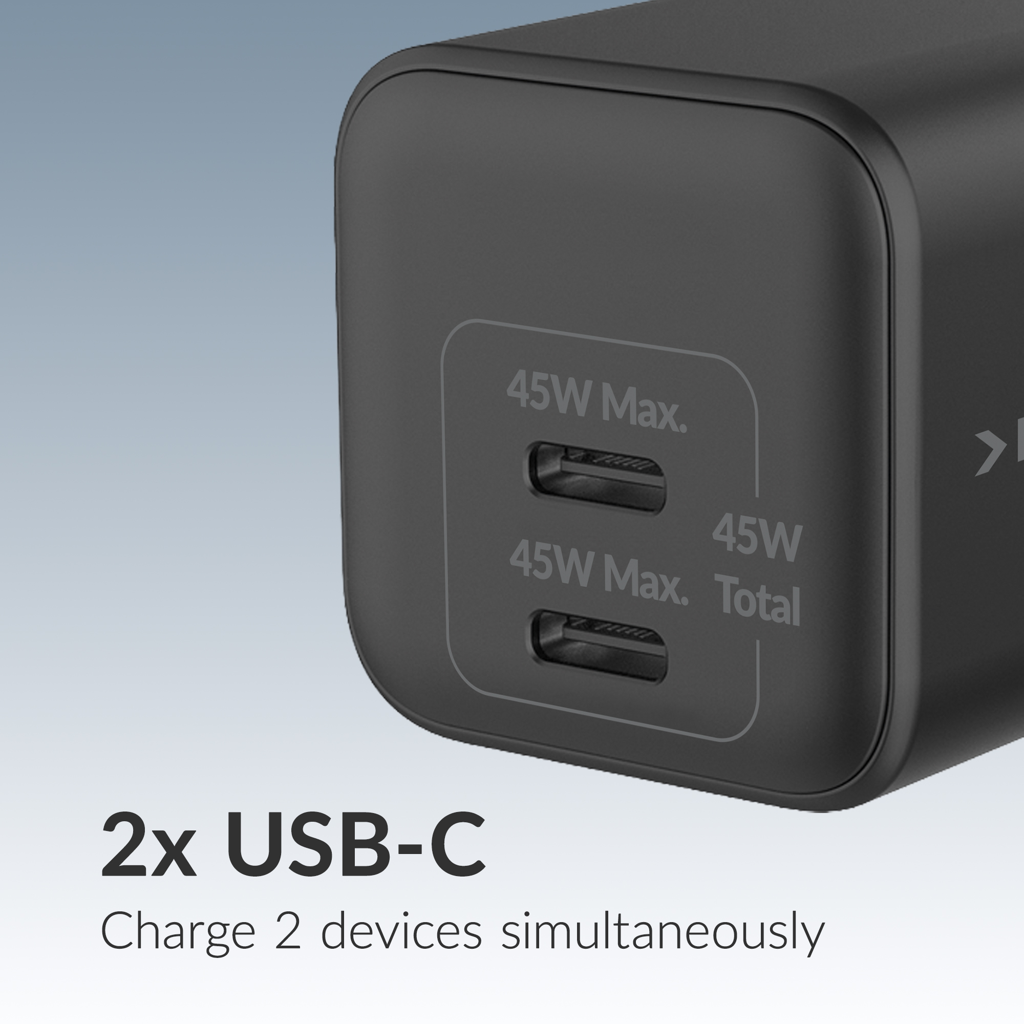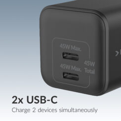 – Max Output: USB-C1 – 45W / USB-C2 – 45W / USB-C1 + USB-C2 – 20W + 25W (45W totaal)