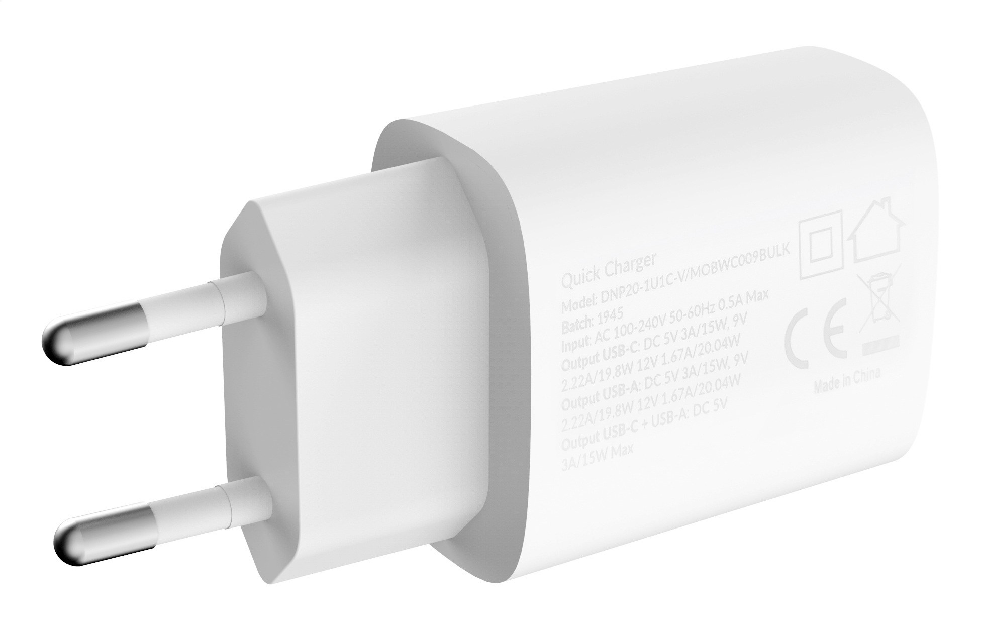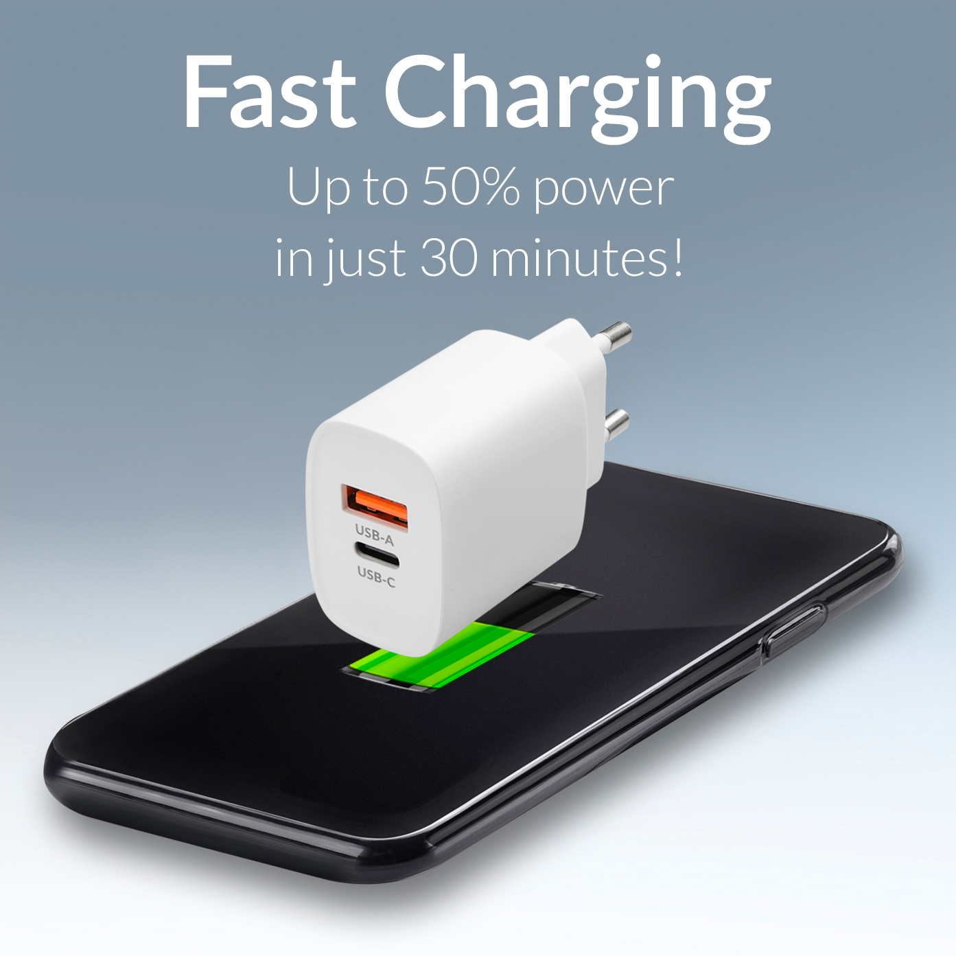 De Mobilize Mobilize Wall Charger USB-C + USB 20W charger is een uiterst complete charger voor thuis, kantoor of op vakantie. Met 20W is het een snelle lader die altijd precies levert wat jouw toestel vraagt. Wanneer je één toestel laadt zij het via USB-C of USB-A dan wordt jouw toestel altijd met maximaal 20W opgeladen wanneer jouw toestel daar om vraagt. Ga je twee toestellen tegelijk laden en beide poorten gebruiken dan is er maximaal 15W beschikbaar verdeelt over de twee poorten.