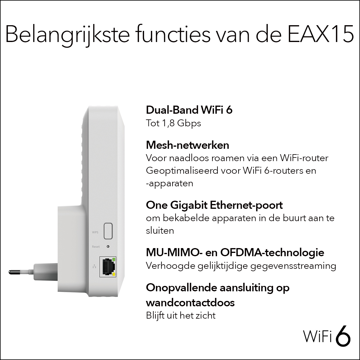 NETGEAR WiFi 6 Mesh Range Extender (EAX15) – Dekking tot maximaal 100 m² en meer dan 20 apparaten, met AX1800 dual-band draadloze signaalversterker en -repeater (tot een snelheid van 1,8 Gbps), WPA3-beveiliging, Smart Roaming
