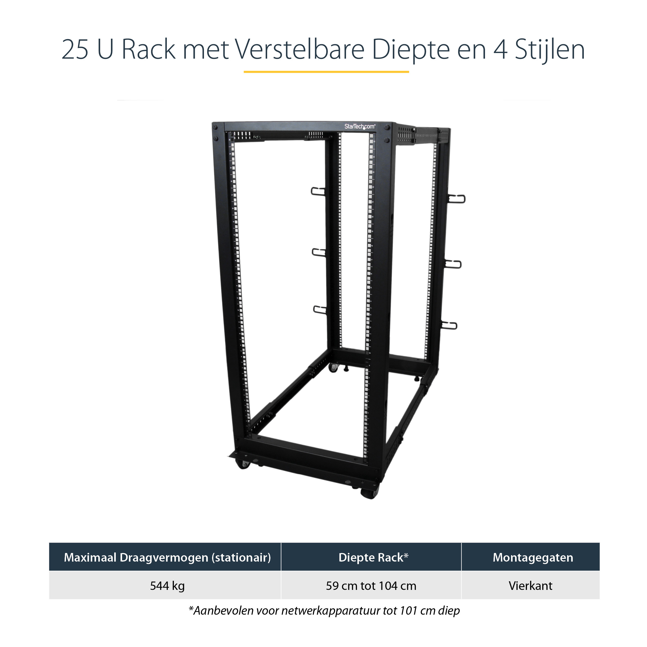 Installeer uw servers, netwerk- en telecommunicatieapparatuur in dit verstelbare 25U open-frame rack