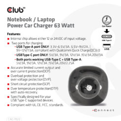 CLUB3D Notebook / Laptop Power Car Charger 63 Watt