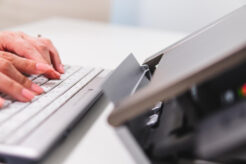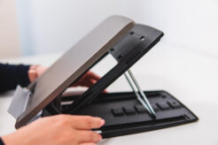 De Ergo-Q 330 Circular is een mobiele laptopstandaard met geïntegreerde documenthouder