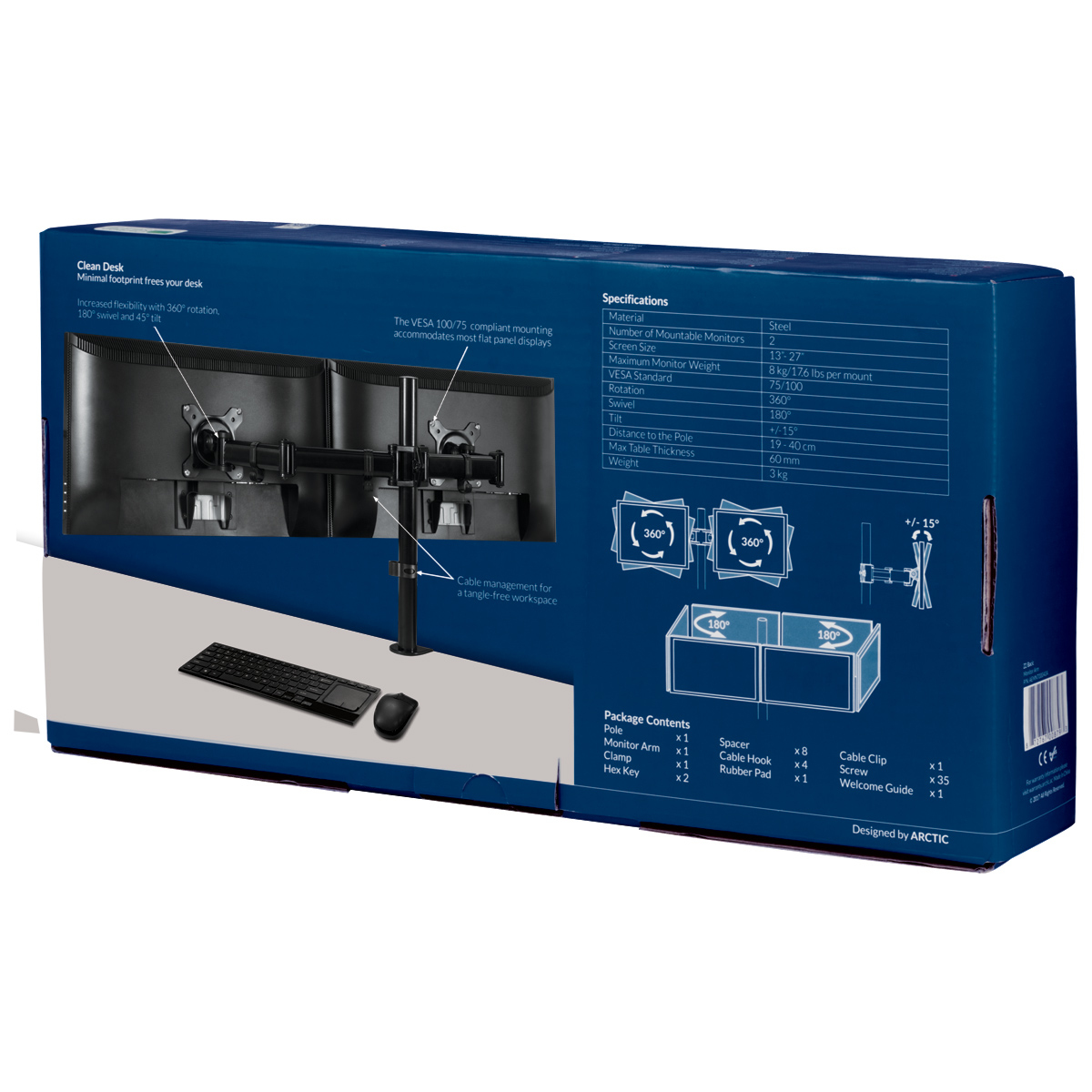 | – Maximale gewichtscapaciteit: 16 kg – Minimale schermgrootte: 33 cm (13″) Maximale schermgrootte: 68,6 cm (27″) – Aantal displays ondersteund: 2 – Klem Montagewijze: Bureau – Montage interface compatibiliteit (max): 100 x 100 mm – Verbeterd kabelbeheer – Staal Zwart |