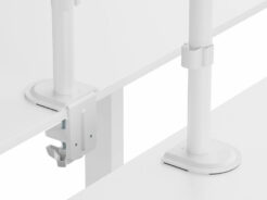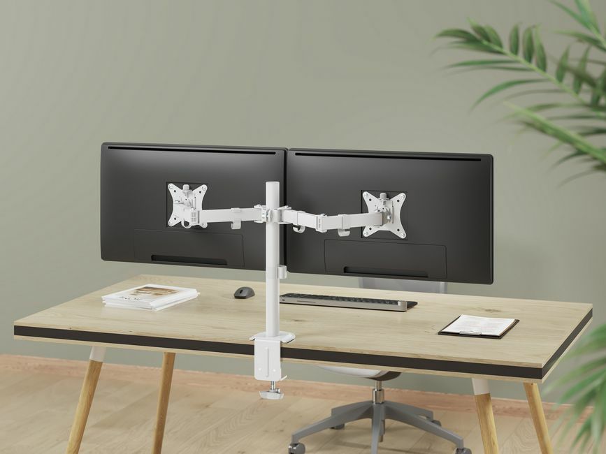 De beugel is ontworpen om bureauruimte vrij te maken en een gestroomlijnde opstelling te creëren. De duurzame constructie zorgt voor stabiliteit en ondersteuning van je monitor. Met zijn witte afwerking voegt hij een modern tintje toe aan je werkplek. Deze dubbele bureaubeugel is eenvoudig te installeren en voorzien van functies voor kabelbeheer, ideaal voor het creëren van een comfortabele en georganiseerde werkomgeving.