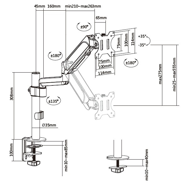 De beugel is eenvoudig te installeren en klemt op je bureau, waardoor je kostbare werkruimte bespaart. De scharnierende armen bieden een groot bewegingsbereik, zodat je je monitor op de perfecte hoogte en in de perfecte hoek kunt plaatsen. De gasveerstructuur voegt een niveau van flexibiliteit en precisie toe aan de positionering van het beeldscherm, waardoor het comfort en de productiviteit worden verhoogd. Met zijn duurzame constructie en slanke ontwerp is deze beugel een uitstekende keuze voor het creëren van een meer ergonomische en georganiseerde werkplek.”