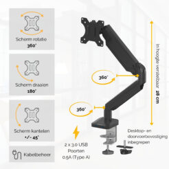 | – Maximale gewichtscapaciteit: 8 kg – Maximale schermgrootte: 101,6 cm (40″) – Aantal displays ondersteund: 1 – Klem/doorvoertule Montagewijze: Bureau – Montage interface compatibiliteit (max): 100 x 100 mm – In hoogte verstelbaar kantel aanpassingen – Verbeterd kabelbeheer – Staal Zwart |