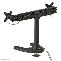 Met deze Neomounts monitorsteun, model FPMA-D700DD, bevestigt u twee flatscreens aan het bureau via een bureauvoet of bureaudoorvoer. Beide worden meegeleverd.