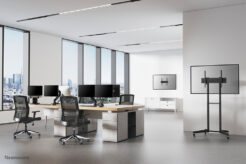 De trolley is voorzien van vier solide zwenkwielen -waarvan twee met rem- waardoor de vloersteun overal gebruikt kan worden. Een slim kabelmanagementsysteem verbergt en leidt kabels van de houder naar het flat screen.
