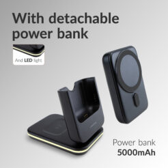 - Afneembare powerbank (5000mAh): Opladen onderweg, draadloos of via kabel