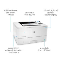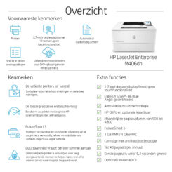 | – Bedrijf Laser – 1200 x 1200 DPI – Printkleuren: Zwart – A4 38 ppm – Duplex printen – USB-poort Wifi Ethernet LAN Bluetooth – LCD Ingebouwd display – Gebruiksindicatie (maximaal): 100000 pagina’s per maand – Totaal aantal invoerladen: 2 Totale invoercapaciteit: 350 vel Totale uitvoercapaciteit: 150 vel – Intern geheugen: 1024 MB Type processor 800 MHz |