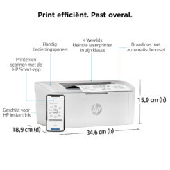 Print efficiënt. Past overal. Een efficiënte, hoogwaardige laserprinter die bij je ruimte en je budget past. Print snel met HP’s kleinste laserprinter in zijn klasse[1] en de tijdbesparende HP Smart-app.[2,3] Kies voor laserafdrukken van professionele kwaliteit en een eenvoudige installatie..
