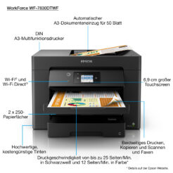 | – Thuis & kantoor Inkjet Afdrukken in kleur – 4800 x 2400 DPI – Printkleuren: Zwart, Cyaan, Magenta, Geel – A3 – Scannen in kleur Faxen in kleur – Epson Connect, Epson iPrint, Epson Email Print, Epson Remote Print, Apple AirPrint, Mopria Print Service – USB-poort Wifi Ethernet LAN – 18,2 kg |