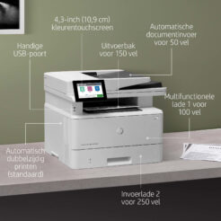 | – Bedrijf Laser Zwart-wit afdrukken – 1200 x 1200 DPI – Printkleuren: Zwart – A4 38 ppm – Zwart-wit kopiĆ«ren Scannen in kleur Zwart-wit faxen – Apple AirPrint, HP ePrint, Mopria Print Service – USB-poort Ethernet LAN – Intern geheugen: 2048 MB Type processor 800 MHz – 13 kg |