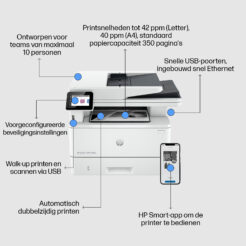 | – Bedrijf Laser Zwart-wit afdrukken – 1200 x 1200 DPI – Printkleuren: Zwart – A4 40 ppm – Kopiëren in kleur Scannen in kleur Zwart-wit faxen – Apple AirPrint, Mopria Print Service – USB-poort Ethernet LAN – Intern geheugen: 512 MB Type processor 1200 MHz – 12,6 kg |