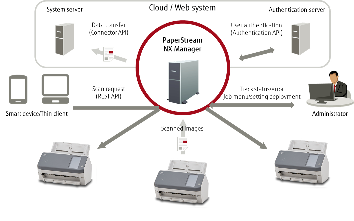 De gebruikersverificatiefunctie, het taakmenu en de andere scaninstellingen worden allemaal centraal beheerd met PaperStream NX Manager en Scanner Central Admin. Dankzij de serversoftware van de fi-7300NX is het niet meer nodig om een omgeving met één clientcomputer per scanner te hebben en kan het systeembeheer op afstand worden uitgevoerd. Dit bespaart tijd en geld bij installatie, uitbreiding, gebruik en beheer. Taken beheren en afbeeldingen verwerken met PaperStream NX Manager. Scannerwerking controleren met Scanner Central Admin.