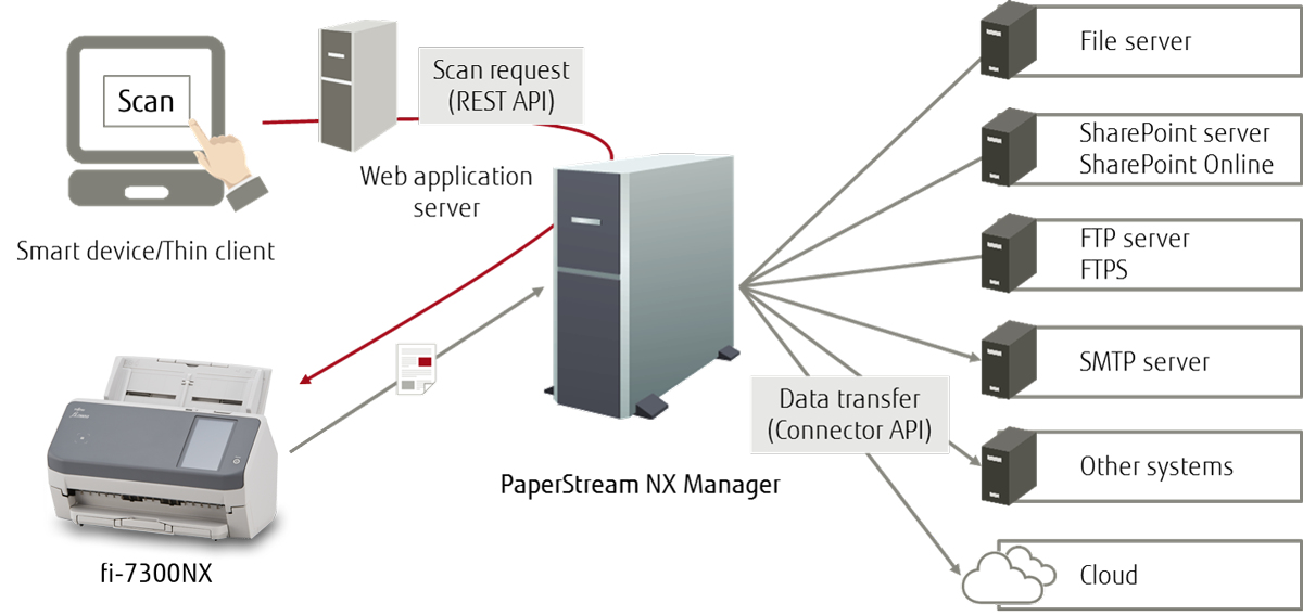 Gebruikers kunnen documenten scannen en opslaan zonder dat ze een computer nodig hebben. Ze kunnen gewoon inloggen op de scanner, hun gegevens worden geverifieerd en daarna kunnen ze een taak kiezen uit de gepersonaliseerde taakmenu’s op het touchscreen van de fi-7300NX. Dankzij de aangepaste taakmenu’s wordt voor iedere gebruiker efficiënte en beveiligde gedecentraliseerde gegevensinvoer gegarandeerd. De fi-7300NX ondersteunt NFC-verificatie (type-A en type-B) en gebruikersverificatie met gebruikersnaam en wachtwoord via het touchscreen. Ook is het mogelijk aan iedere scanner andere taakmenu’s toe te wijzen en de scanner te gebruiken zonder verificatieproces. Met PaperStream NX Manager kunnen gebruikers scannen vanuit mobiele of webgebaseerde apps op mobiele apparaten en thin clients. Dankzij de naadloze integratie met bedrijfssystemen kunnen verschillende apparaten worden gebruikt voor scanwerkzaamheden.