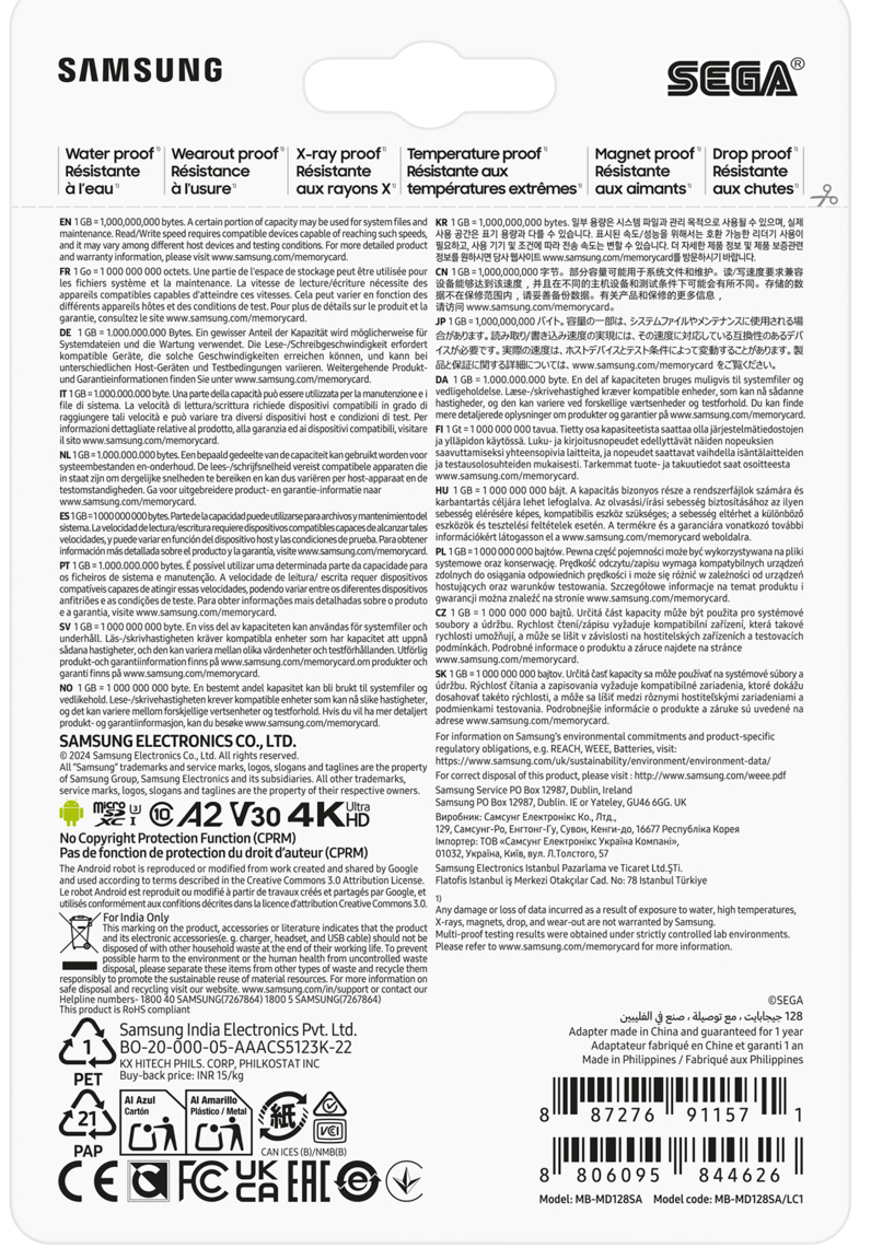 | – 128 GB MicroSDXC Klasse 10 UHS-I – Class 3 (U3) V30 180 MB/s – A2 – Valbestendig, Magneetbestendig, Temperatuurbestendig, Waterbestendig, Röntgenbestendig – Grijs, Rood, Wit |