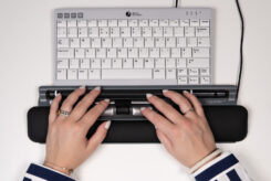 De ErgoSlider+ is een centrische muis die voor het lichaam wordt geplaatst en met beide handen gebruikt kan worden.