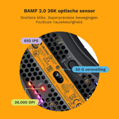 Het Model 2 bevat onze BAMF 2.0 Sensor met 26.000 DPI en 650 IPS-tracking en houdt al je muisbewegingen bij met moeiteloze precisie. Zijn krachtige sensor en lag-vrije 1.000 Hz polling over 2,4 Ghz draadloos zorgen dat de muis naadloos aansluit op jouw wil in bliksemsnelle games.