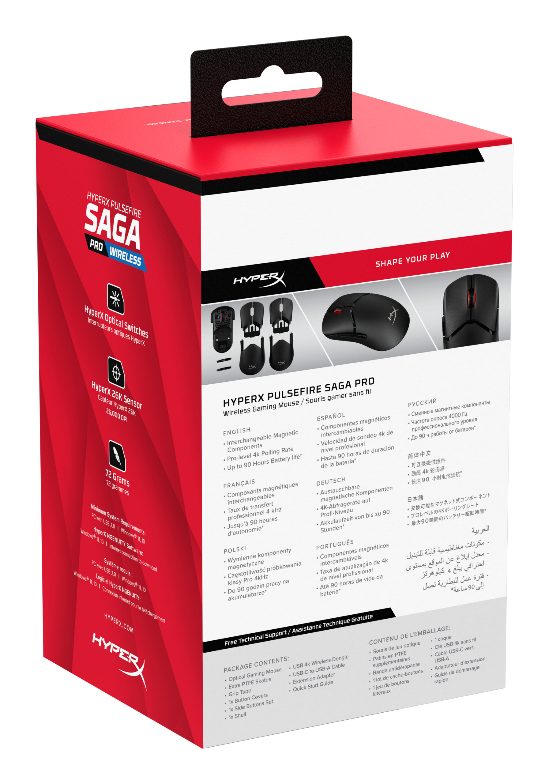 Maak kennis met de meest aanpasbare gaming muis van HyperX: de Pulsefire Saga Pro. Deze muis biedt 16 unieke gripcombinaties dankzij de verwisselbare, ergonomisch ontworpen onderdelen. Verander de muis in een handomdraai met de magnetische onderdelen, zonder ook maar één schroevendraaier. Geniet van maximaal comfort en wendbaarheid dankzij het ultralichte gewicht van slechts 72 gram. Ervaar een ongekend snelle responstijd dankzij de draadloze pollingsnelheid van 4000 Hz. Lange gamesessies? Geen probleem! Met Pulsefire Saga Pro kun je tot 90 uur[1] gamen met een pollingsnelheid van 1000 Hz met één keer opladen. Daar houden de upgrades niet op. De Pulsefire Saga Pro combineert laserprecisie met een prettige tactiele feedback dankzij de HyperX Optical Switches. In tegenstelling tot traditionele switches, die mechanisch contact vereisen, maken optische switches gebruik van een lichtgevoelig mechanisme dat klikken direct omzet in acties. Geen debounce, zonder vertraging. De Pulsefire Saga Pro biedt ook twee draadloze aansluitmogelijkheden via een snelle 2,4 GHz draadloze dongel of Bluetooth met compatibele apparaten. Of gebruik Instant Pair en verbind draadloos met compatibele OMEN gaming laptops zonder extra dongels. De aanpassingsmogelijkheden gaan verder dan je denkt. Maak verbinding met de HyperX NGENUITY-software om motion-tracking in te stellen tot 26.000 DPI, knoppen te personaliseren, de pollingsnelheid aan te passen, aangepaste RGB-effecten in te stellen en de batterijduur te bekijken.