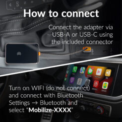 De Mobilize Adapter for Wireless Apple CarPlay/Android Auto biedt een eenvoudige en snelle manier om van een bedrade naar een draadloze verbinding over te stappen voor Apple CarPlay en Android Auto. Deze compacte en efficiënte adapter maakt het mogelijk om zowel iPhones als Android-toestellen draadloos te verbinden met je voertuig, wat zorgt voor meer gebruiksgemak en een opgeruimd dashboard.