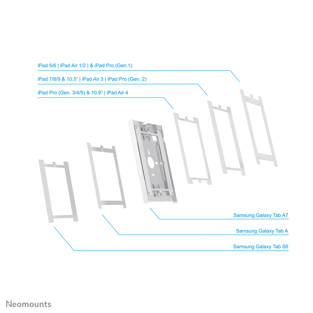 De Neomounts WL15-650WH1 is een wand tablethouder die in zowel portrait en landscape oriëntatie kan worden geïnstalleerd. Het slimme ontwerp bevat zes verschillende tablet-inlegpanelen waardoor de tablethouder geschikt is voor diverse 9,7-11″ tablets*.